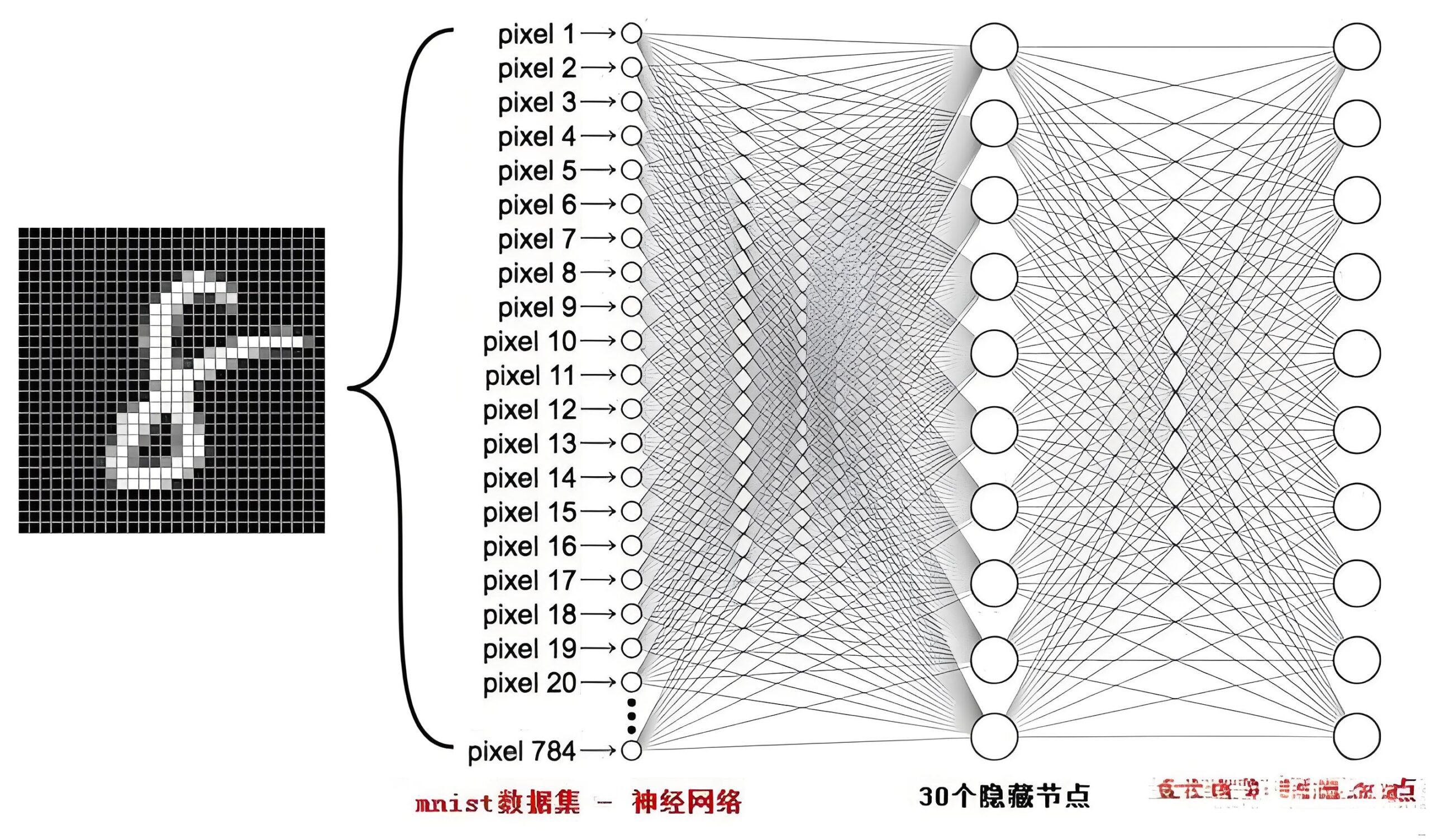 本实例中使用最基础的多层神经网络(mlp)来识别这些手写图片,其中包括了一个输入层、两个隐藏网络层和一个输出网络层,mlp模型是学习神经网络的基础中的基础。