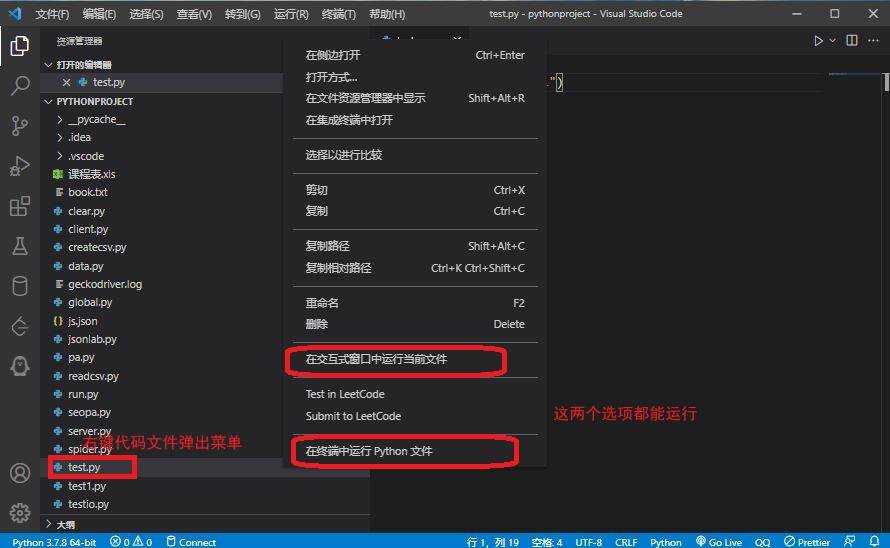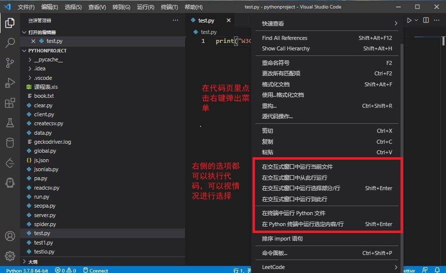 右击鼠标,选择在交互式窗口运行文件,如果有提示需要安装内核,直接点安装即可(没有安装会一直显示在连接 Python 内核):(这里VSCode会使用python的pip进行安装,部分版本会安装失败,小编在尝试的时候使用python3.8版本失败了,3.7版本成功了)