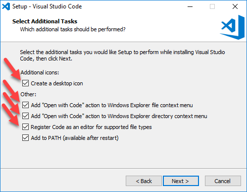 VSCode 安装比较简单,打开官网 https://code.visualstudio.com/,下载软件包,一步步安装即可,安装过程注意安装路径设置、环境变量默认自动添加到系统中,勾选以下所有选项:
